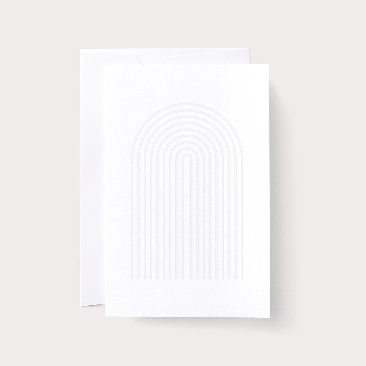 Letterpress printed by New England craftsmen, on elegant Crane 100% cotton, tree-free paper. Custom card size 4.75” x 7.25”. Signature Noat envelope. Limited edition. Inside: Rainbow colorfield