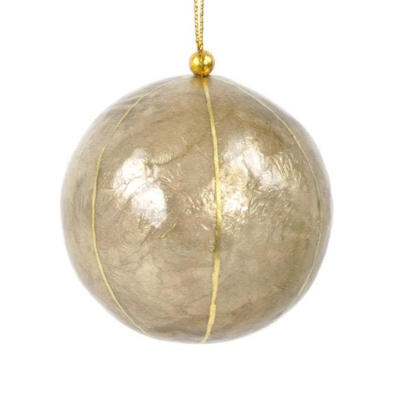 Elevate your holiday decor with these exquisite ornaments crafted from Capiz shells, a natural treasure found in abundance in the seas surrounding the Philippines. Each ornament showcases a unique finish, featuring elegant gold stripes that add a touch of sophistication to any setting.