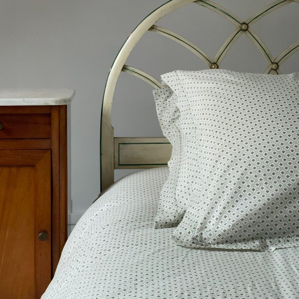 Duvet cover hand block printed in India with a dark green and white lucky clover motif on 100% cotton. Available in Twin, Queen and King Sizes. Fill Sold Separately.