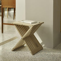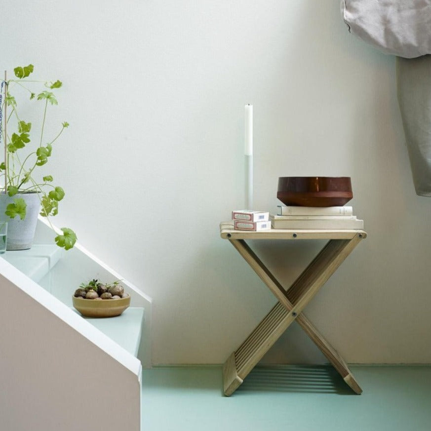 Fionia stool is a modern, Nordic interpretation of the ancient X-chair. This lightweight folding stool has a simple, triangular construction with a stable surface often used as a bedside table or elegant stand for books, pots and flowers. Designed in 1986 in collaboration with Danish designer, Jens. H. Quistgaard, Fionia stool has become a long-standing favourite piece thanks to its versatility and simple beauty that can lift practically any room. The Fionia Tray fits seamlessly on top to create the perfect side or lounge table. The Fionia Stool is available in both Oak and Teak versions. Teak Version Suitable for Wet Spaces.