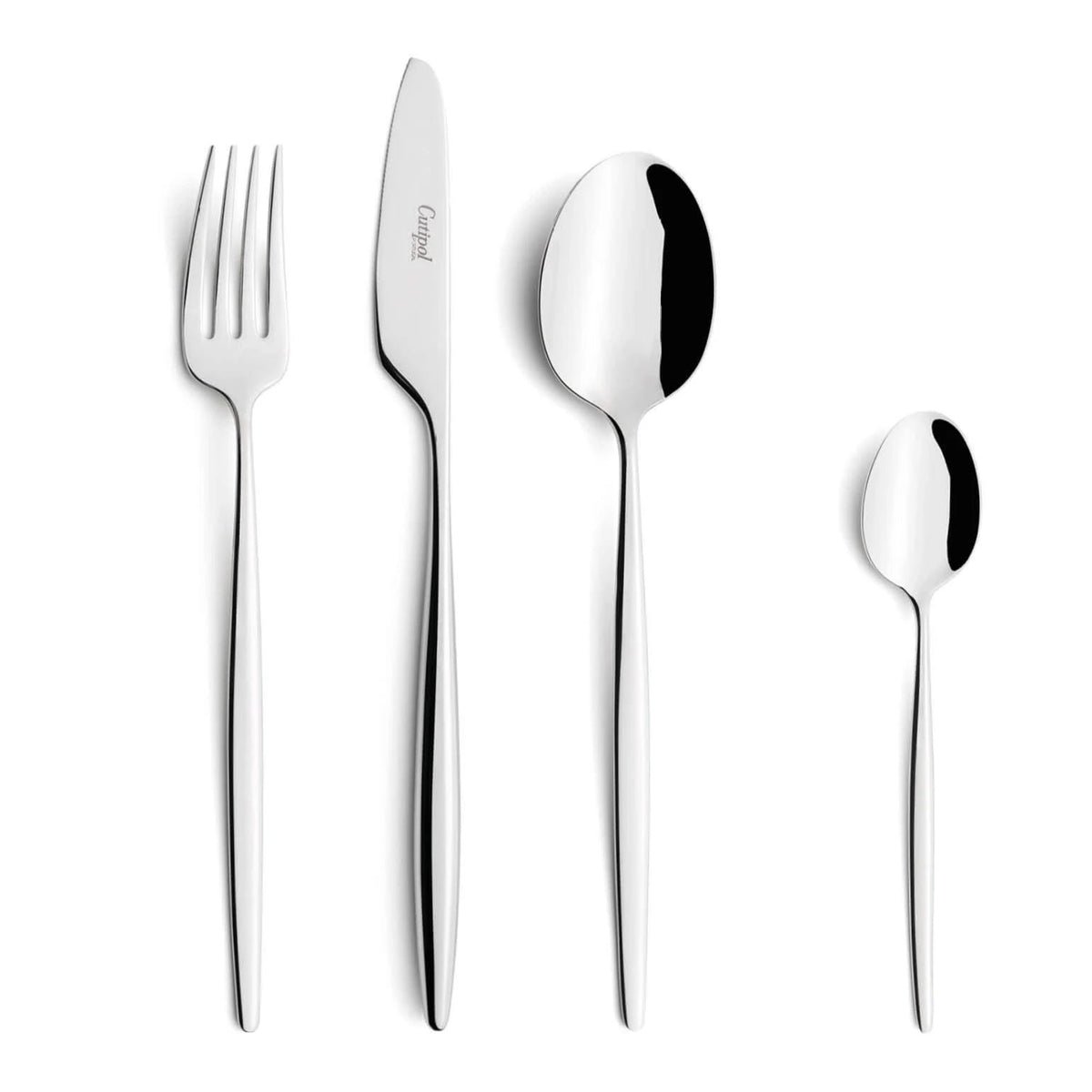 The Solo Cutipol collection has the following parts: dinner knife, dinner fork, table spoon, dessert knife, dessert fork, dessert spoon, fish knife, fish fork, coffee/tea spoon, moka spoon, soup ladle, serving spoon, sugar ladle, serving knife, serving fork, sauce ladle, pie server, salad set, pastry fork, butter knife, long drink spoon, steak knife, cheese knife, snail fork, soup spoon, and gourmet spoon.