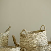 Made of Natural Palm Leaves and flexible. Storage should be light and pretty and that's easy with this basket. The basket is practical and easy to move around with its two handles. The weave pattern is a lovely detail.