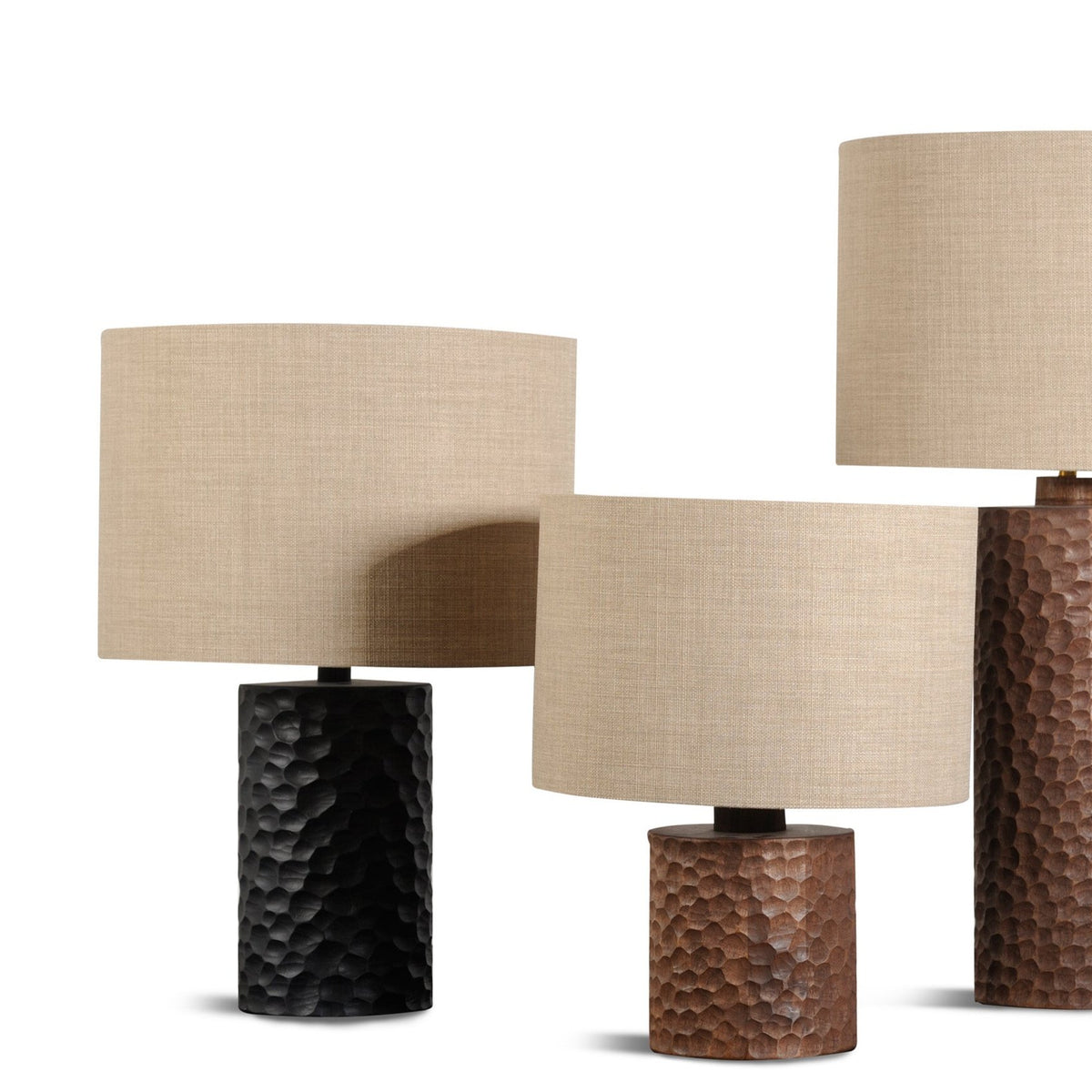 Features: Handcarved Base in White Oiled Maple, Black Stained Maple or Natural Oiled Walnut. Fabric Shade in Natural Linen.